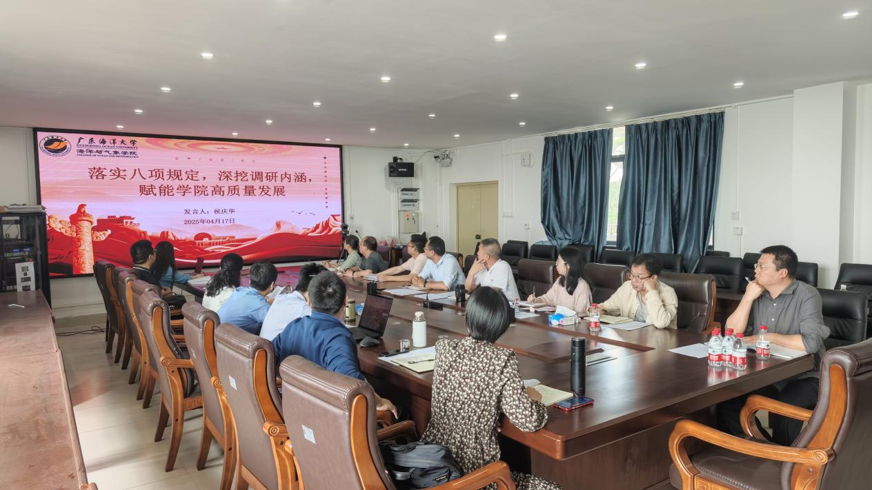 会议紧扣“第一议题”制度,毛琪同志领学了习近平总书记在二十届中央纪委四次全会上的重要讲话精神。薛宇峰副院长结合学院实际作主题发言,强调深化理论武装,将“两个维护”融入党中央决策部署,确保习近平总书记关于教育及海洋强国战略的重要指示在学院有效落实。胡森林副书记传达了2025年学校全面从严治党工作会议暨警示教育大会精神及学校相关文件精神,着重指出中央八项规定的严肃性,要求警惕“四风”隐形变异问题,营造清正育人环境。海洋科学系教工党支部谢辉同志与研究生党支部吴迪同志分别展示了各自党支部的特色做法与创新成果,凸显了党支部在学科建设和人才培养中的关键作用,为样板党支部建设奠定了基础。兼职组织员黄瑞焕同志精心组织了党务培训,针对具体问题进行了精准指导,有效提升了党务干部的专业素养,使党建工作成为推动学院发展的强大引擎。侯庆华副院长以“落实八项规定,深挖调研内涵,赋能学院高质量发展”为题讲授党课,结合调研实践,为学院党建工作提供了新思路。
