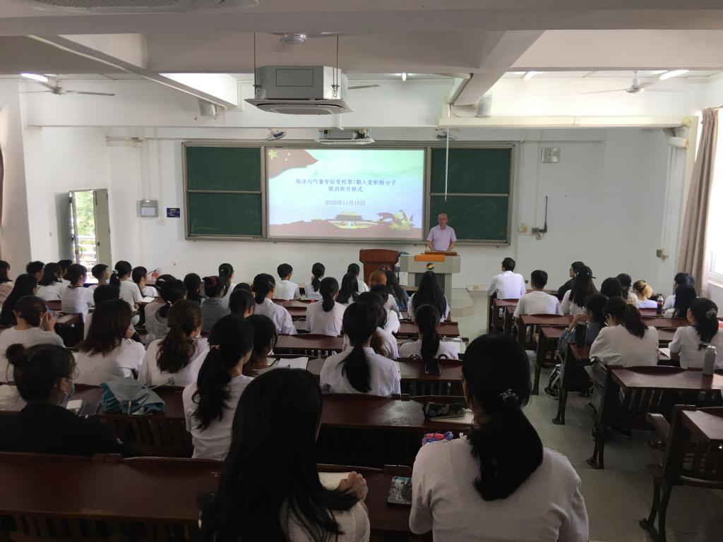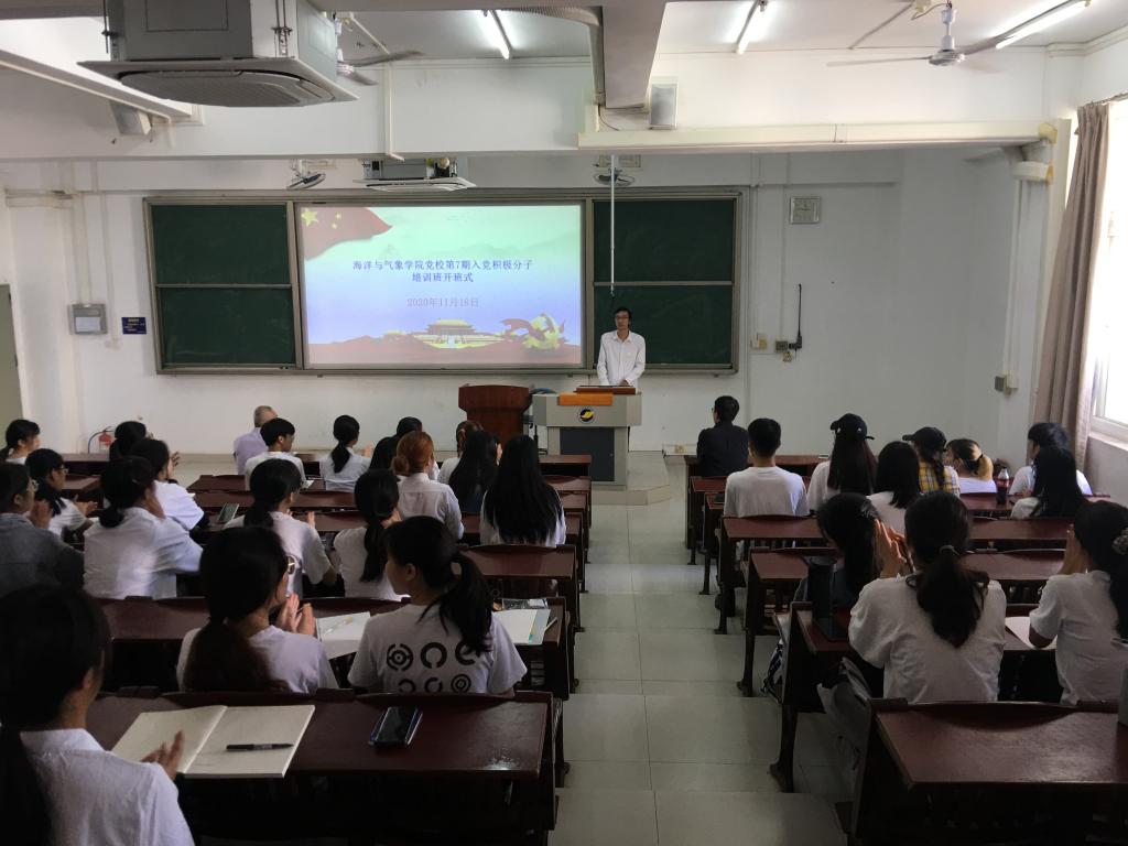 2020年11月18日下午,学院分党校在钟海楼05020举行第7期入党积极分子培训班开班式,学院党委书记陈晓、学院党委副书记纪委书记刘宏英、海洋科学系学生党支部书记梁敬伟、大气科学系学生党支部书记钟艺晴,学院2020年全体入党积极分子70余人参加,开班式由组织员马登值主持。