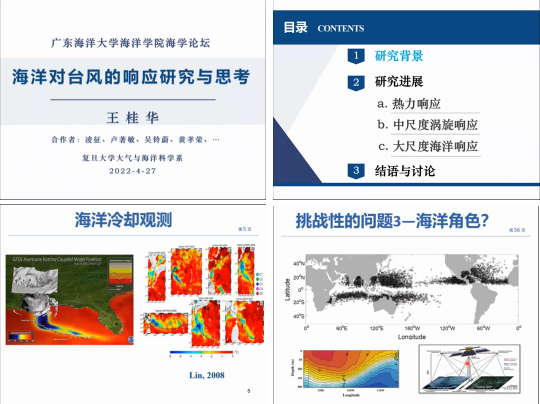 王桂华教授作了题为“海洋对台风的响应研究与思考”的学术报告。王教授首先为我们简要介绍了有关台风的研究背景,王教授认为热带气旋影响海洋的方式多种多样,包括在海洋冷却观测、海洋涡旋、风生环流、热盐环流以及渔业发展等方面均有显著的影响。紧接着,王教授着重为我们简单介绍了其所在团队于热力响应、中尺度涡旋响应和大尺度海洋响应等领域的研究进展。最后,鉴于台风与海洋相互作用复杂,海上观测仪器设备较为昂贵,王教授建议各个研究团队之间应当加强相互合作,以降低研究成本。同时王教授指出未来海气相互作用的研究应当侧重于如何做到观测精细化、如何缩小台风强度预报的误差等方面。