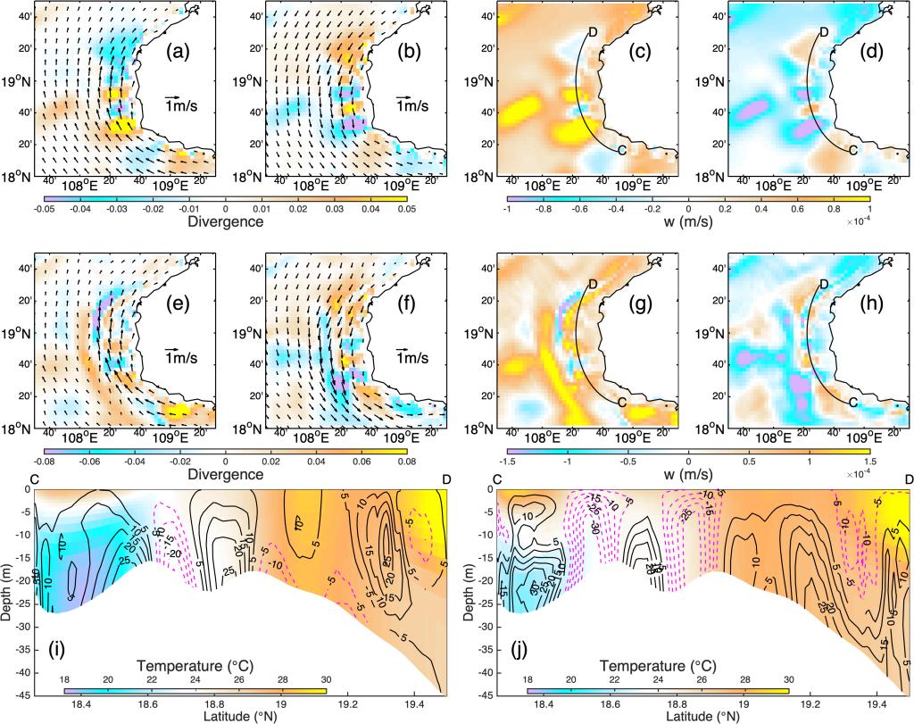 图1.正压实验模拟的海南岛西侧海域涨潮流(a)及落潮流(b)期间深度平均的水平流场及其散度场,以及涨潮流(c)和落潮流(d)期间深度平均的垂向流速。(e),(f),(g)和(h)依次与(a),(b),(c)和(d)相同,但为斜压实验结果。断面CD上涨潮流(i)及落潮流(j)期间温度及垂向流速分布,图中黑色实线指示正(向上)垂向速度,紫色虚线标识负(向下)垂向速度,绘图时垂向速度量值放大1000倍。