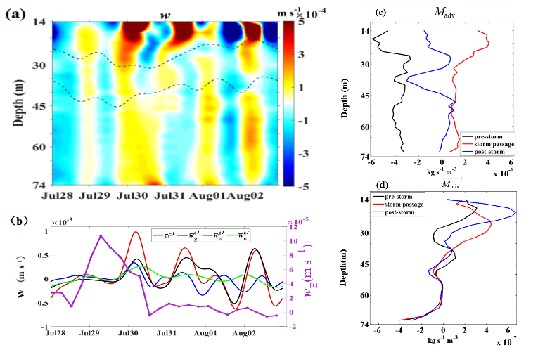 (a)垂向流速时间-深度分布图,(b)混合层平均垂向流速及各垂向流速分量,(c)台风前后及期间垂向对流质量输运,(d)台风前后及期间垂向混合扩散质量输运