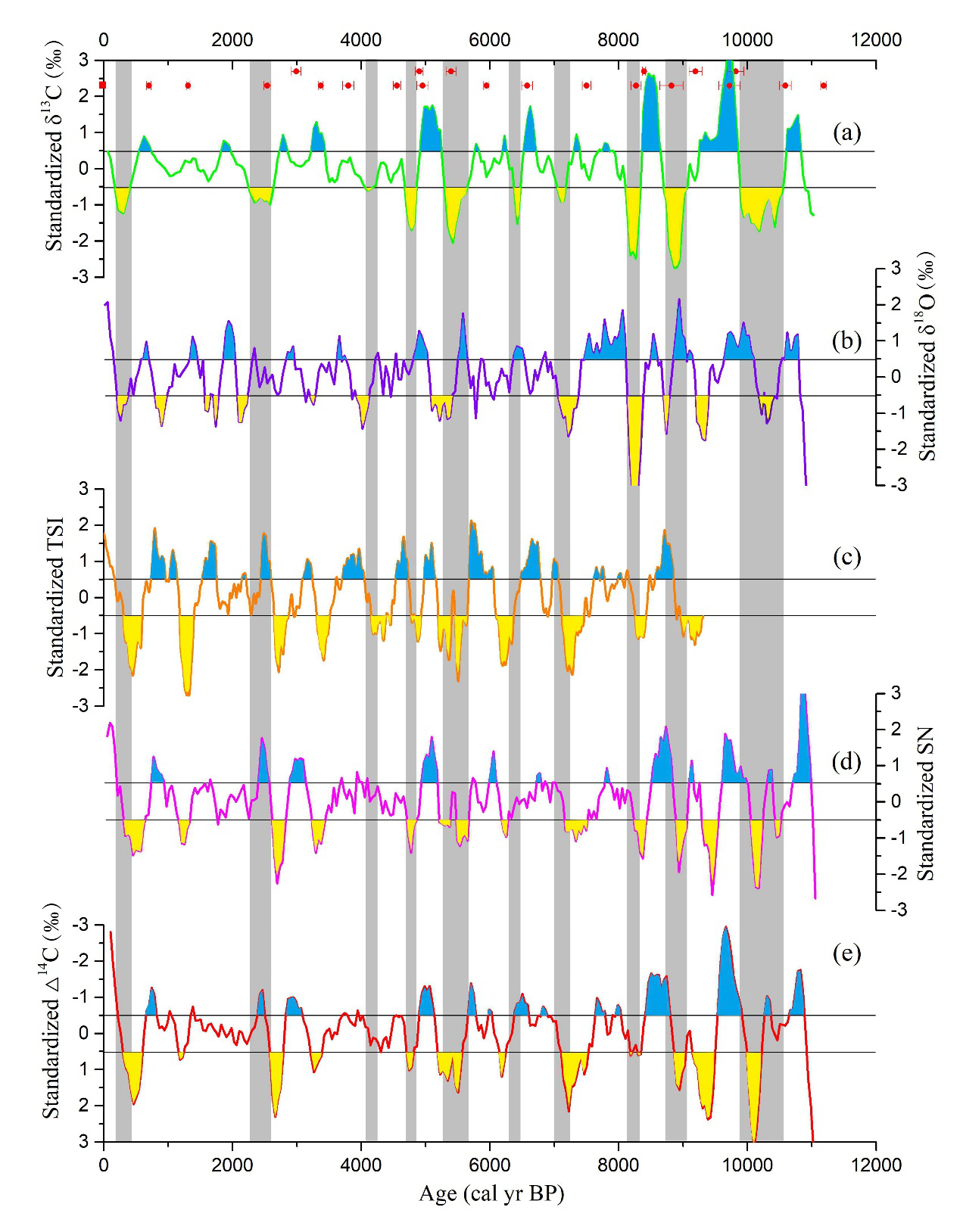 图3阿勒泰泥炭纤维素δ13C记录与太阳活动指标记录的对比