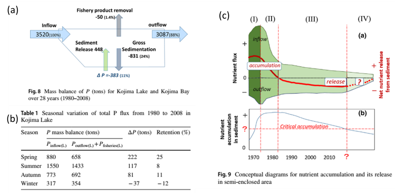 (a) 28年见近海磷收支模型,(b)沉积物对磷蓄积释放的季节性特征,(c)近海沉积物临界蓄积量对富营养化治理响应的4个过程