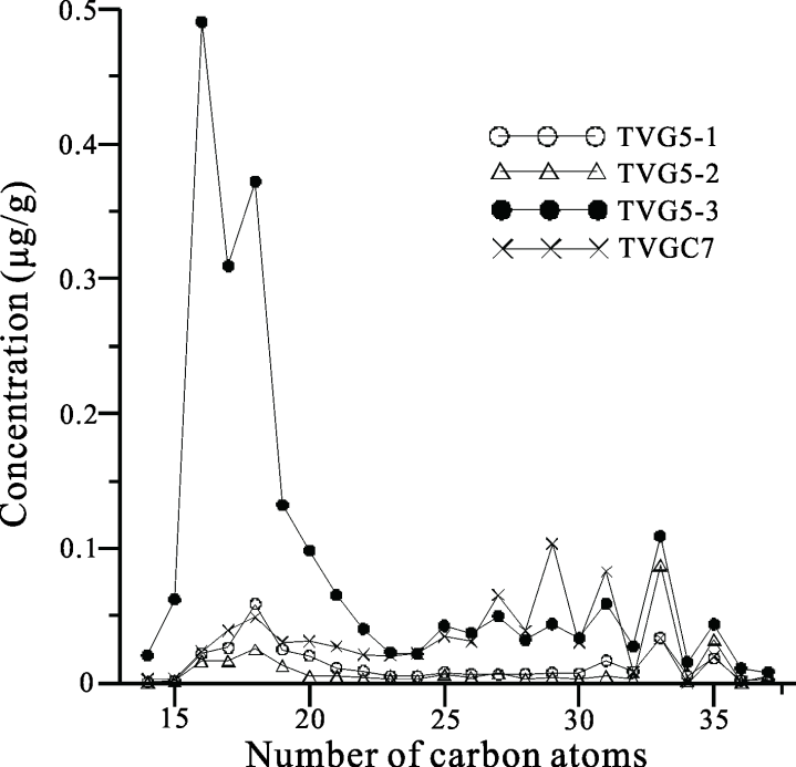 通过研究表明,蚀变岩石和远洋沉积物样品中正构烷烃(图2)呈现出明显的双峰分布,同时高分子正构烷烃具有明显的奇数碳优势,表明蚀变岩石和远洋沉积物样品中正构烷烃主要来源于陆源高等植物的输入;热液硫化物和热液沉积物中低分子正构烷烃(图2)占主要成分,同时呈现出明显的偶数碳优势,可能是水生生物和热液微生物共同作用的结果;热液沉积物中正构烷烃单体碳同位素(图3)表现出随着碳元素个数增加δ13C值减小的趋势,暗示出热液沉积物中部分的正构烷烃可能来源于非生物合成作用,其非生物合成正构烷烃不能忽略。
