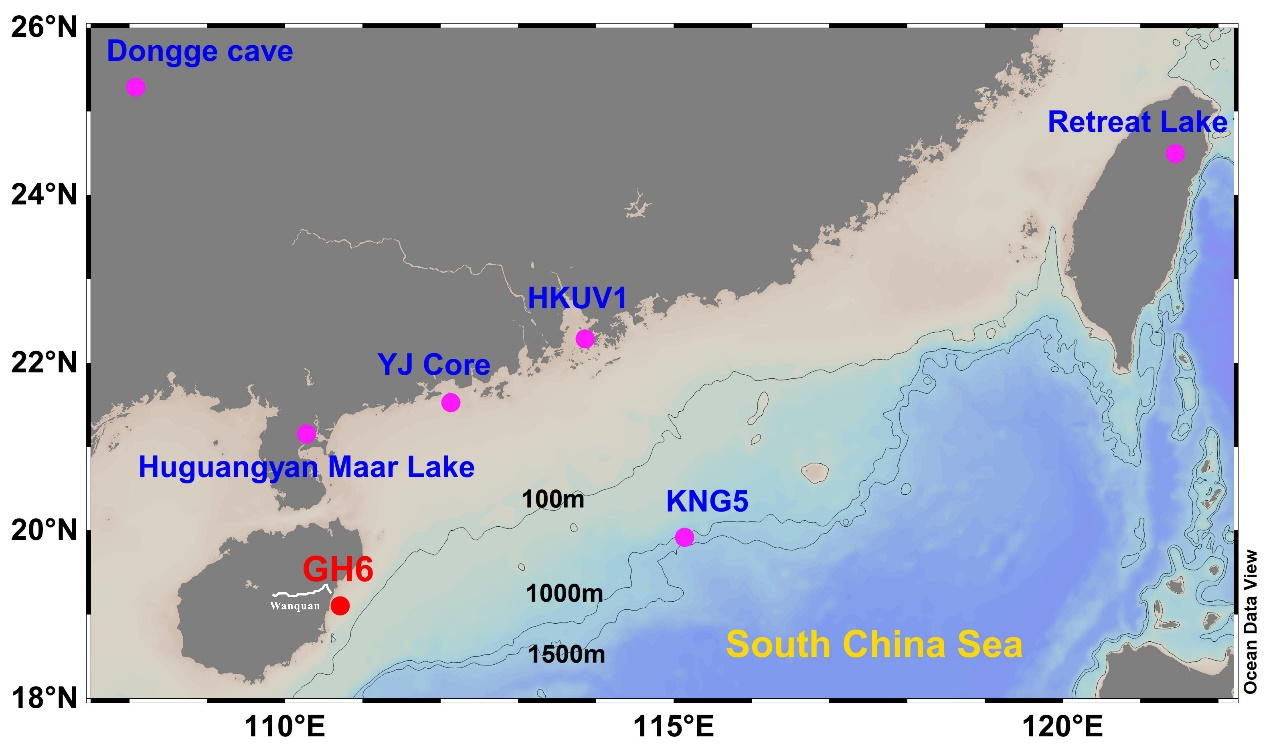 英国上市公司365海洋地质团队成员黄超博士利用采自琼东海域大陆架GH6岩芯(图1),通过AMS14C测年建立岩芯的年龄–深度模式,进而开展高分辨的过去7000年气候演化与人类活动影响的重建工作。结果发现,在5400-4900calyrBP期间琼东地区发生了一次显著地气候突变事件,这与季风区其他研究发现的弱季风事件一致。该弱季风事件刚好与减弱的太阳活动、较强的ENSO活动以及北大西洋冰伐事件发生的时间吻合(图2),表明太阳活动可以通过影响ENSO系统和北大西洋对亚洲夏季风产生重要影响。近1500年以来,GH6岩芯记录的化学风化和陆源输入逐渐增强,且岩芯沉积物中的低频和频率磁化率大幅度增加,金属元素Cu和Pb的含量也迅速增加(图3)。这些岩芯沉积记录的增加趋势与海南岛的开发历史基本一致。然而,亚洲季风区多种地质载体的研究结果发现,夏季风在近1500年呈现整体减弱的变化(图3)。我们推测,由于人口的增加、农业生产的发展以及采矿冶炼活动的扩张,引起土壤侵蚀的增强和金属元素含量(Cu和Pb)的增加,进而导致陆源输入到近海陆架上沉积物的增加。因此,近1500年以来,琼东地区逐渐增强的人类活动取代了自然气候条件成为地表环境改造的主要控制力量。