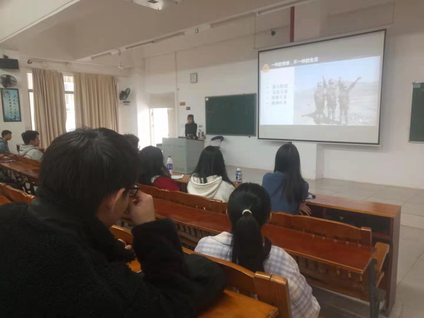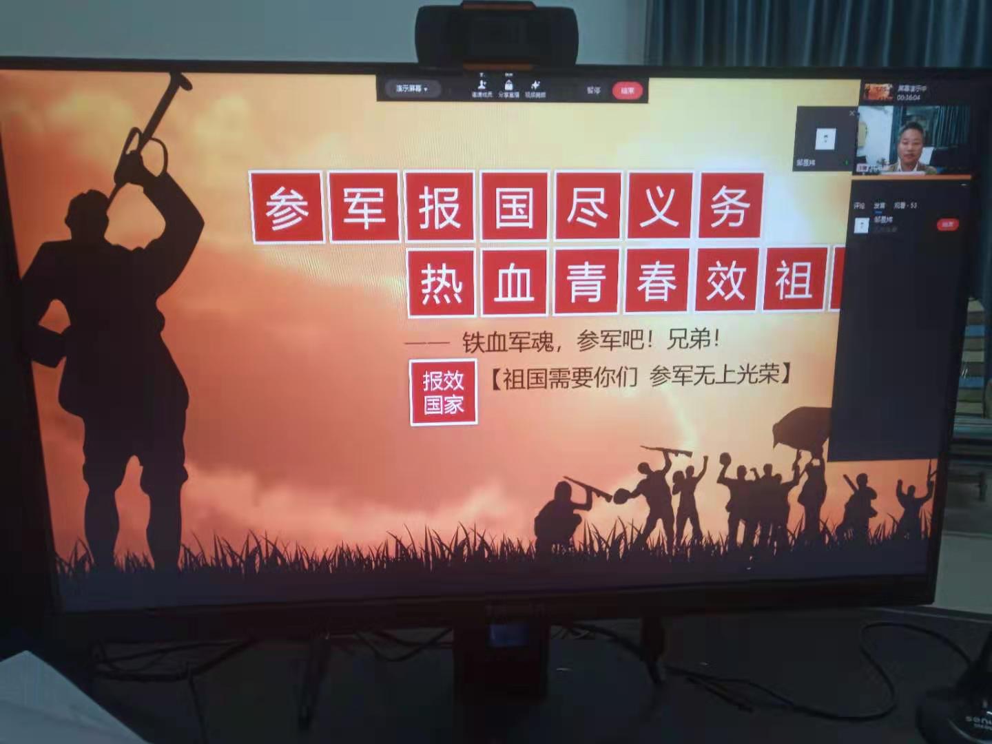 师生宣讲会结束后,通过学校企业微信,在全院学生中进行宣讲,线上宣讲由兼职武装干部、辅导员林海峰老师主持,海地1183班杨桂琼、海洋1191班邹昱炜和海气1193班黄港珍三位同学以观看军营视频、照片、报道等方式,图文、声情并茂,与同学们回忆热血军营生活,鼓励同学们积极投身军营,青春在逐梦中成长,人生因奋斗而升华;参军报国,不负年华,一次选择,一生无悔!立即行动,向祖国报到!