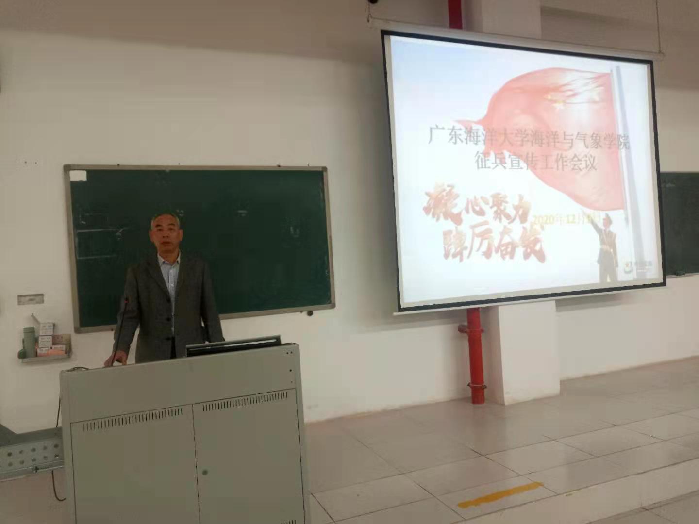 在学校征兵宣传月中,学院积极营造浓厚宣传氛围,采用线上线下相结合的方式,在海洋科技楼的电子屏幕中播放宣传标语,在班级微信群发放征兵资料和公布全国征兵网的网址链接;以退伍的学生为主组建征兵宣队伍,积极以“征兵和国防教育报告会”“先进典型事迹宣讲会”的形式,用身边人讲述身边故事,用身边事带动身边人,鼓励和引导更多大学生参军入伍。