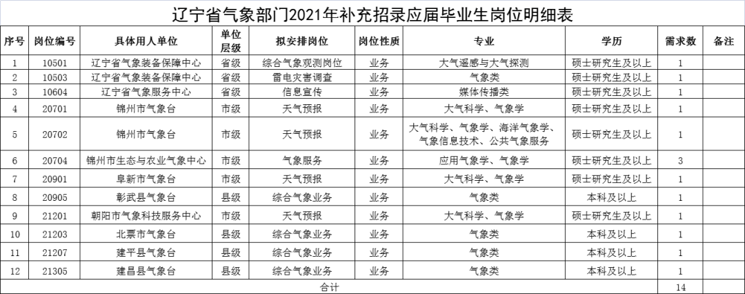 按照《气象部门事业单位公开招聘应届高校毕业生管理办法(试行)》(气发〔2015〕53号)和《辽宁省气象部门2021年毕业生招录工作方案》的相关规定,根据前期报名实际情况,现就辽宁省气象部门2021年补充招录应届毕业生报名后的空余岗位进行报名。2021年5月11日至2021年5月17日报名并通过资格审查的考生不得再次报名或调整申报岗位。前后两轮通过报名资格审查的所有考生统一参加辽宁省气象局组织的笔试和面试。具体事宜公告如下: