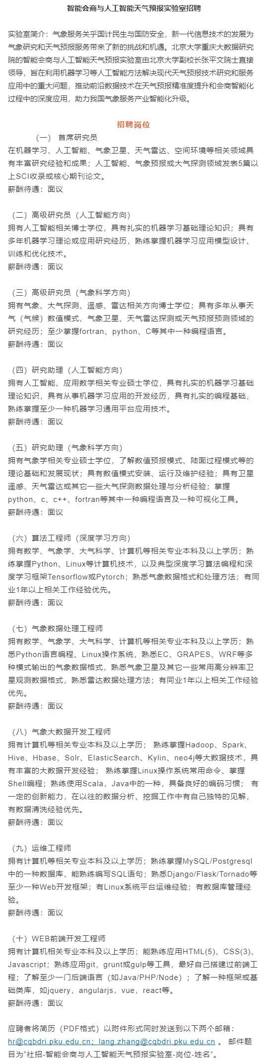 北京大学重庆大数据研究院智能会商与人工智能天气预报实验室招聘