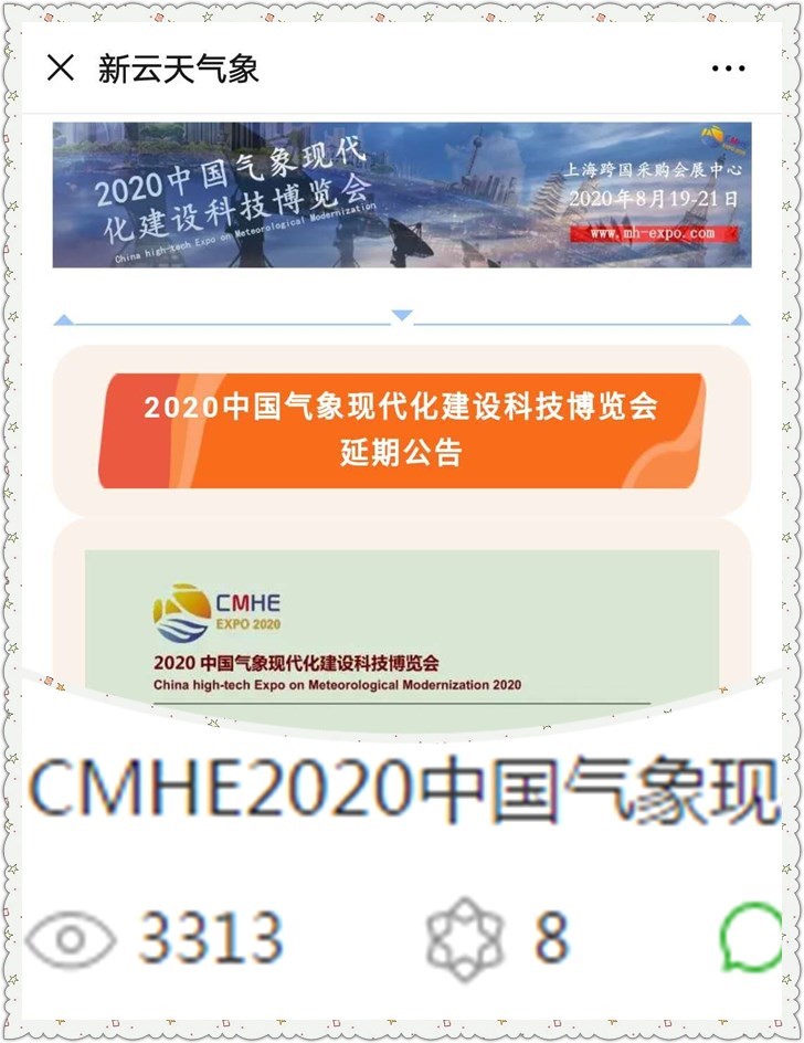 2月27日,新云天气象工作室接到中国气象现代化科技博览会组委会发来通知,受突发公共卫生事件响应机制影响,原定于2020年4月举办的“2020中国气象现代化科技博览会”延期至8月19至21日,工作室承办的两个重要同期活动——“2020上海国际气象人才招聘会”和“第二届大气与环境科学青年人才论坛”也一并延期举行。通知发布时,已有近50家用人单位,400名气象人才报名参加招聘会,数十名校内外气象专家、研究生报名参加学术论坛。工作室立即启动应急预案,通过微信公众号发布了题为《CMHE2020中国气象现代化建设科技博览会延期至8月19-21日举办》的头条推送,24小时内阅读量即超过3000人次,为组委会分忧解难,受到组委会工作人员好评。同时,通过QQ、邮件和短信等方式通知参会代表延期事宜,并引导原计划赴上海参加招聘会的应届毕业生改为参加“大气与海洋科学2020届高校毕业生春季网络招聘会”。活动延期后,各项筹备工作继续有序开展。让我们许下约定,“战疫”胜利后,相约八月,再会上海!
