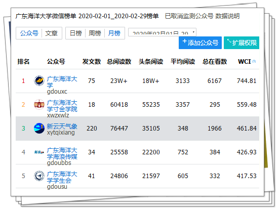 同时,工作室继续做好“新云天气象”公众号的运营,建立师生工作微信群,通过在线采编,集思广益,推送了《坚守!中南地区疫情防控通用航空气象服务平台上线!》《广东省气象大喇叭打通乡村防疫宣传“最后一公里”》等介绍气象人抗击疫情事迹的文章。公众号2020年2月共发布推送文章220篇,实现总阅读数超7.6万人次,微信影响力指数(WCI)达461分,成功进入英国上市公司365微信榜单前三名,建成全国气象业内有较大影响力的自媒体平台,促进了学院创新创业氛围的形成。