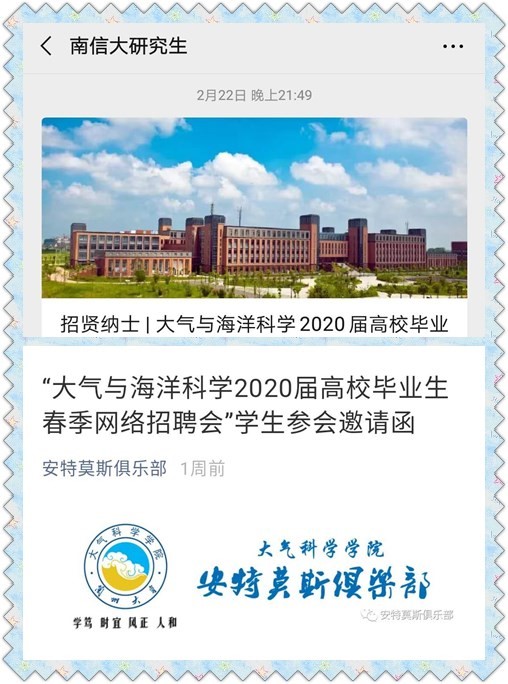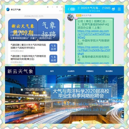 2月23日起,根据中央、广东省和学校对毕业生就业工作的相关要求,新云天气象工作室举办的“大气与海洋科学2020届高校毕业生春季网络招聘会”通过互联网正式开幕,为2020春季全国首个大气与海洋类招聘会。工作室全体同学及校内外导师克服部分企事业单位尚未复工等困难,成功邀请到复旦大学大气研究院、中科院大气所、南信大气象科技研究院、粤港澳大湾区气象监测预警预报中心、象辑科技、中科三清等12家知名企事业单位进入通过“新云天气象”微信公众号、QQ群和网站(http://www.xytqx.com/)搭建的虚拟展位,开展“空中宣讲”“在线面试”等招聘活动,提供高质量就业岗位近200个,涵盖大气科学、海洋科学等英国上市公司365优势专业,也覆盖计算机类、数理类、资环类、文管类等通用专业。
