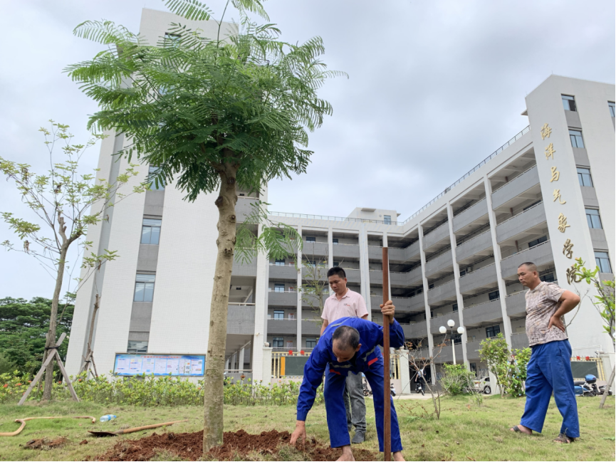 6月9日上午七点半,海气1193班的几名男同学早早地来到海科楼前。园艺叔叔给同学们分配好工具,大家便开始忙活起来。清风为伴,绿草为邻,在园艺叔叔阿姨的指导与帮助下,齐心协力挥锹铲土、扶树植苗、提桶浇水……各个环节衔接有序、配合默契。经过一上午的辛勤劳作,大家亲手栽种的凤凰木在海科楼草坪上“安家落户”。它们清正超然地迎阳而生,在六月热情似火的风中轻灵喜悦地交舞,俊秀舒朗的身姿萌发出盎然生机,孕育了无限希望,向上挺立,述说着春光,收获了繁茂;往下扎根,领悟着坚守,厚植了初心,不仅为校园景致谱下了些许古雅的“韵律”,也为学院环境增添了几抹新绿的“颜值”。