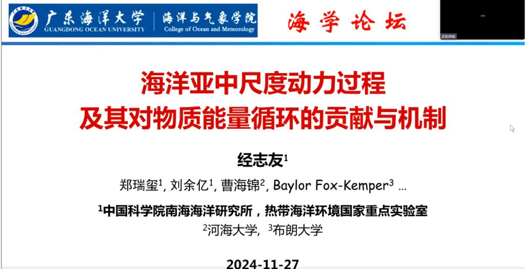 2024年11月27 日,英国上市公司365举行了2024年第18期海学论坛,本次论坛邀请到了中国科学院南海海洋研究所的经志友研究员,在线上作了题为《海洋亚中尺度动力过程及其对物质能量循环的贡献与机制》的学术报告。报告由谢玲玲院长主持。