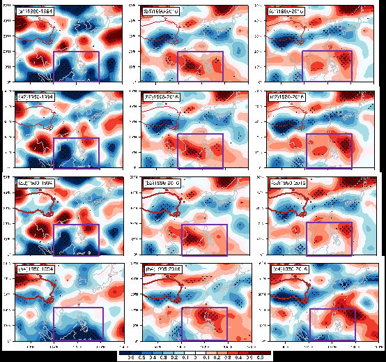 在近三十几年青藏高原表层气温快速增暖的背景下,青藏高原东部夏季的气温(TPST)在1996年前后存为显著的年代际变化。该研究记录了青藏高原夏季地表温度与南海夏季风降水(SCSSMP)关系的变化。采用逐步回归模型排除了全球变暖因子、厄尔尼诺-南方涛动(ENSO)、西北太平洋副热带高压(WNPSH)、大西洋多年代际涛动(AMO)和太平洋十年代际涛动(PDO)等信号。结果表明,TPST-SCSSMP关系随时间变化,从1980-1994年为负相关关系,到1998-2016年为明显的正相关关系。同时,TPST与东亚副热带锋(梅雨)的负相关关系在1998-2016年增强。这种TPST - SCSSMP关系的变化与大气环流的变化有关,这主要是由于TPST的年代际变化所致。波列在低纬度沿着低级季风流向东移动,强大的气旋环流明显在西南高原的一部分,包括印度支那半岛,南中国海,菲律宾以东和海洋,这也与TPST和向外长波辐射(OLR)之间的负相关相一致。水汽辐合增多,对流条件更加有利,导致90年代后期以后该地区降水增多。目前的结果表明,在变化的气候背景下,在使用具有年代际变化的预测指标时应当注意。
